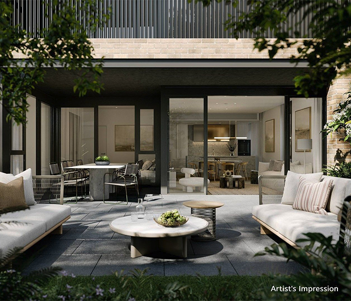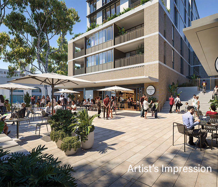 Convenience meets urbanity on the sundrenched terrace of the Plaza**, a bespoke space designed to support a local restaurant, café or providore. Designed to be a social hub for residents and the community, the Plaza is destined to become a much-loved local for the neighbourhood, connecting to the parks, gardens and playground at NINE by Mirvac.